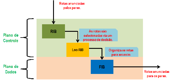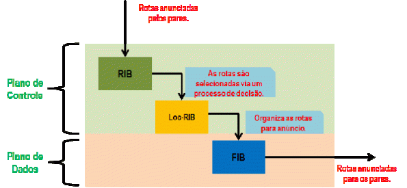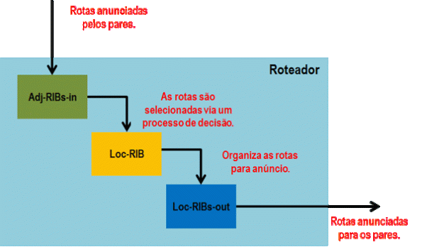 Loc-RIB: A informação armazenada nessa tabela é aquela que está na tabela Adj-RIBs-in e que passou pelo chamado Processo de Decisão (parte do sistema operacional dos roteadores). Tal Processo de Decisão considera entre outras, as definições da política de roteamento definidas pelos administradores do equipamento, incluindo, por exemplo, os filtros de entrada em protocolos como o BGP.