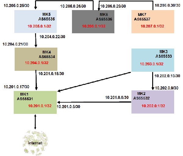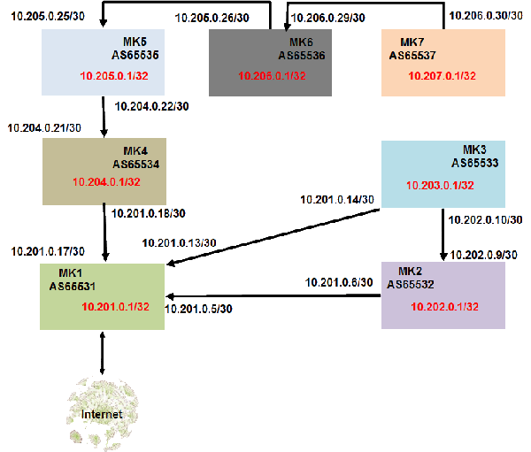 O MK3 andou preocupado com a sua conexão com a Internet via MK2. Completa ausência de redundância. Trânsito é mais barato, via MK2, mas não suficientemente confiável. Não propriamente, por MK2, mas pelos dois enlaces até MK1. Então, MK3 resolveu negociar trânsito com MK1 (uma banda menor, talvez) e assim agregar valor ao seu serviço. Isso que MK3 fez chama-se inovação de valor. A Figura 1, abaixo, exibe a conexão desejada por MK3 e a inserção de uma interface Loopback em cada MKi, para i=1, …, 7. Servirá para exercícios, principalmente de conectividade.