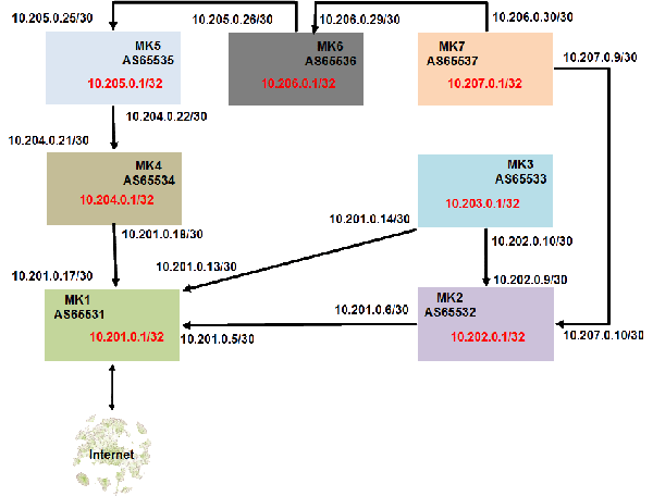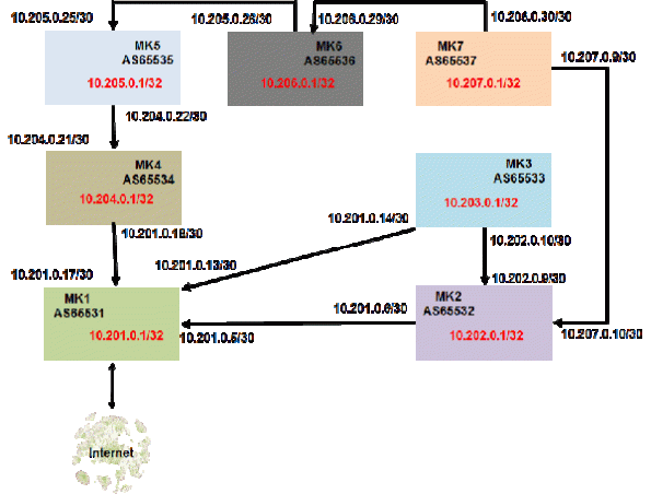 Cada um dos MKi da topologia do FFE, Figura 1, possue configuração BGP multihoming, isto é, conecta-se a pelo menos dois diferentes provedores de trânsito. Nessa proposta de topologia, não estamos interessados em identificar quem é provedor de trânsito e/ou quem é cliente. Em tese, todos são provedores de trânsito ou clientes (exceto o MK1), mas estamos nos abstraindo dessa questão, sem importância no momento. Multihoming possui características técnicas interessantes pois permite pensarmos em redundância e otimização das diversas interconexões. Por outro lado, há uma importante consideração a ser feita em uma topologia multihoming: um AS pode eventualmente se tornar um operador de tráfego de trânsito, sem que ele o queira. Ou saiba… Um documento interessante a esse respeito, entre muitos outros é o [4].