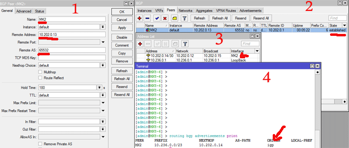 A janela 1, mostra a implementação e a janela 2 confirma que o empareamento foi estabelecido. Os endereços, respectivos, das interfaces para MK2 e da Loopback do MK8 estão na janela 3. A janela 4 mostra que MK8.6 está anunciando o novo /23 para MK2.