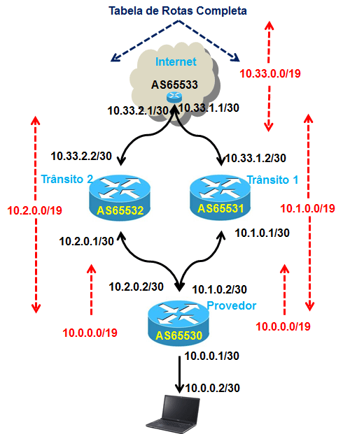 • O AS65530 é o Provedor, proprieamente dito, cuja rede local só possui o Notebook. O Notebook tem acesso direto ao Mikrotik Provedor e somente terá acesso aos outros Mikrotiks virtuais através do BGP que fala do Provedor.
