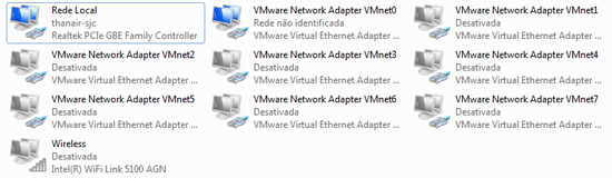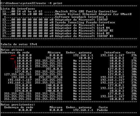 Na Figura 4 vê-se que somente as interfaces da rede local e “VMnet0” estão ativas. Na Figura 5, retirou-se a rota padrão para “VMnet0”, estabelecida automaticamente pelo Windows e acrescentou-se a rota 10.0.0.0/8 para a interface da LAN do Provedor. De ambas, pode-se concluir que a Rede Local do Notebook não é compartilhada com as máquinas virtuais, já que ela é a saída para a Internet via NAT.