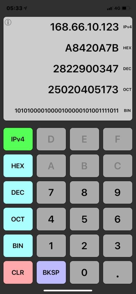 - Usar o /24 para pensar na divisão dos blocos foi uma estratégia baseada no fato de que em cada uma das quatro divisões da representação decimal do IPv4 pode-se fazer operações aritméticas, no limite de 0 a 255. Mas, podemos fazer operações aritméticas sobre todo o IPv4, se o transformamos em um número inteiro. Por exemplo, o IPv4 168.66.10.123 é representado pelo inteiro 2.822.900.347. As operações aritméticas devem estar no limite de 0 (0.0.0.0) a 4,294,967.295 (255.255.255.255). Existem diversas ferramentas que ajudam nas tarefas de conversões. O app DeadBeef é uma ótima opção, como mostra a figura abaixo: