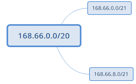 Um bloco /20 possui 16 blocos /24, segundo a tabela acima. Se o dividirmos em dois blocos /21, cada um deles terá 8 x /24. O primeiro bloco é o 168.66.0.0/21 e o segundo é o primeiro, mais 8 x /24: 168.66.8.0/21. Temos, então, a primeira divisão: