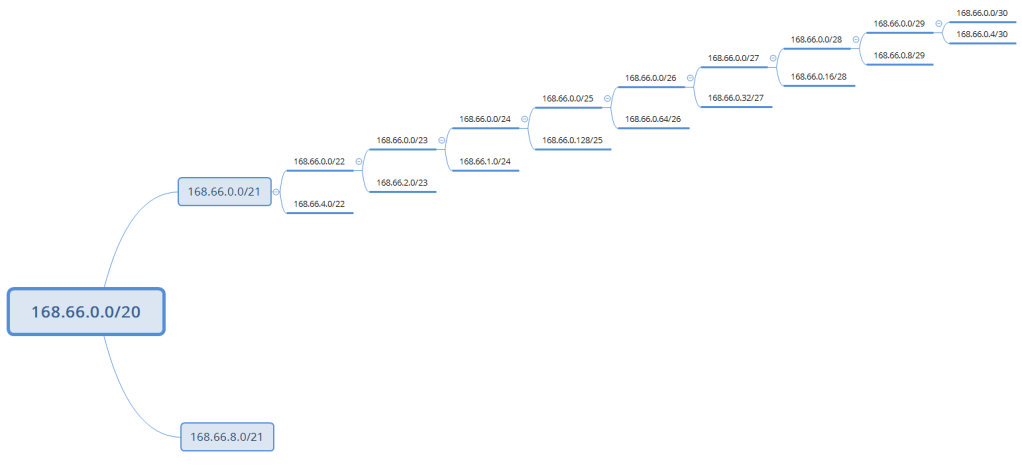 Suponha que um AS tenha recebido um bloco /20. E que um cliente deste AS solicite um bloco /28 para sua rede. Quais IPsv4 devemos entregá-lo? Somente dividindo o /20 em prefixos maiores podermos responder a esta questão. Existem muitas formas de dividir um bloco /20. Vamos seguir aquela que divide os blocos pela metade e usar uma ferramenta como o XMind (https://www.xmind.net/), para apresentar esta divisão.