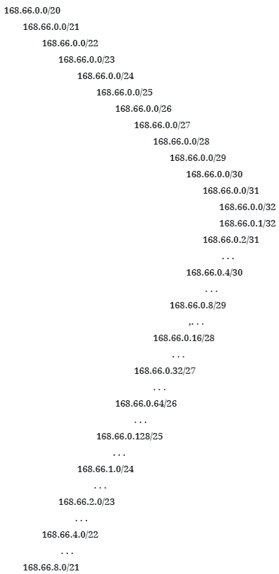 - O /24 ajuda bastante. Suponha o bloco 168.66.128.0/21, que algumas vezes é apresentado como 168.66.128/21. Este bloco tem 8 x /24. O primeiro é 168.66.128/24. o segundo é 168.66.129/24, o terceiro é 168.66.130/24, …, o oitavo é 168.66.135/24.