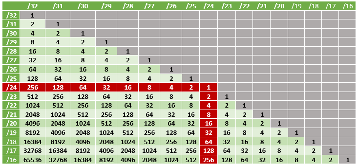 O prefixo /24 está com sua linha e sua coluna em vermelho. O /24 é um prefixo muito interessante pois ele representa a máscara 255.255.255.0, a qual indica que o bloco tem 256 IPsv4! Adicionalmente, o prefixo /24 é interessante para determinar o tamanho dos outros prefixos. Na linha do /24 é possível ver que ele possui 256 x /32, 128 x /31, 64 x /30, …, 1 x /24 (claro!). Na coluna, temos que o /24 possui 1 x /24, o /23, 2 x /24 (512 IPsv4), o /22 possui 4 x /24 e assim sucessivamente!