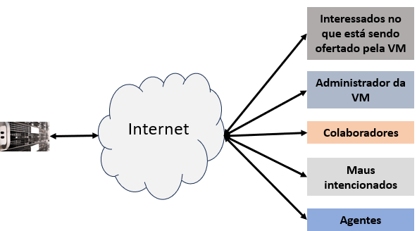 - Interessados no que está sendo ofertado pela VM: Estes interessados somente usarão os recursos disponíveis pelo servidor Apache e facilidades associadas. Prativamente usando navegadores, aplicações em desktop ou em equipamento móvel (telefone celular, por exemplo). São seres humanos que podem estar em qualquer localização, no mundo.