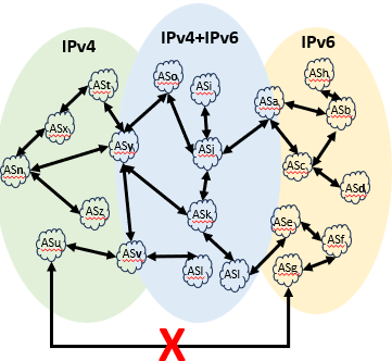 Este sistema autônomo ASn está conectado a um ou mais outros Sistemas Autônomos, que por sua vez estão conectados a outros tantos ASes e assim sucessivamente. Estas conexões de Sistemas Autônomos formam o que conhecemos como Internet (com I maiúsculo). Com a diminuição da oferta de IPv4, e a disponibilidade, sem restrições, do IPv6, a Internet está dividida em três tipos: Internet IPv4, Internet IPv6 e Internet IPv4+IPv6 (pilha dupla). A Figura 3 mostra os três tipos de Internet.