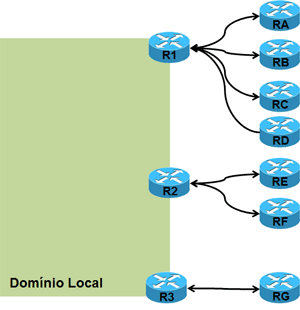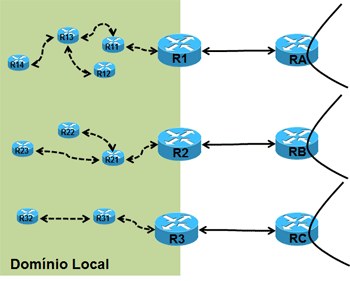 A topologia da Figura 4 é nossa melhor representação, sem dúvida. Mas, existem questões didáticas que remete-nos à Figura 5, para lembar que cada roteador do Domínio Local (DL) possui sua própria rede local (basta ver nossa topologia original, da Figura 2, representadas pelas localidades. Na oportunidade vale lembrar que cada um dos roteadores externos e vizinhos dos roteadores DL, possui seus respectivos domínios, sobre os quais o administrador do DL não consegue interferir diretamente.