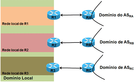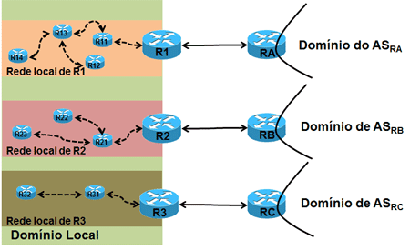 - As setas em vermelho, representam empareamentos BGP. Neste caso temos eBGP pois as conexões são entre Sistemas Autõnomos com ASNs diferentes. Em outras palavras, eBGP é um protocolo EGP5. O eBGP é um dos dois principais componentes do BGP. O outro é o iBGP, que é um protocolo do tipo IGP5. O iBGP é usado para as interconexões entre roteadores de um mesmo AS e, existem diversos protocolos que exercem funções equivalentes ao iBGP (RIP, OSPF, etc.).