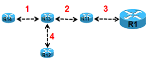 - Se R13 enviar uma atualização de tabela para R11, a entrada para R14 nunca será alterada, pois o custo atual de R14 na tabela de R11 é menor. Logo, qualquer pacote vindo de fora, na direção de R14 passará por R13.