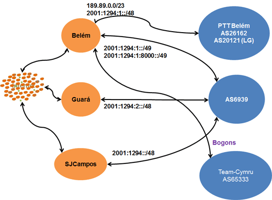 - Há três túneis 6to4, com a Hurricane Eletric, para o mesmo AS6939 (Belém, Guará e SJCampos).