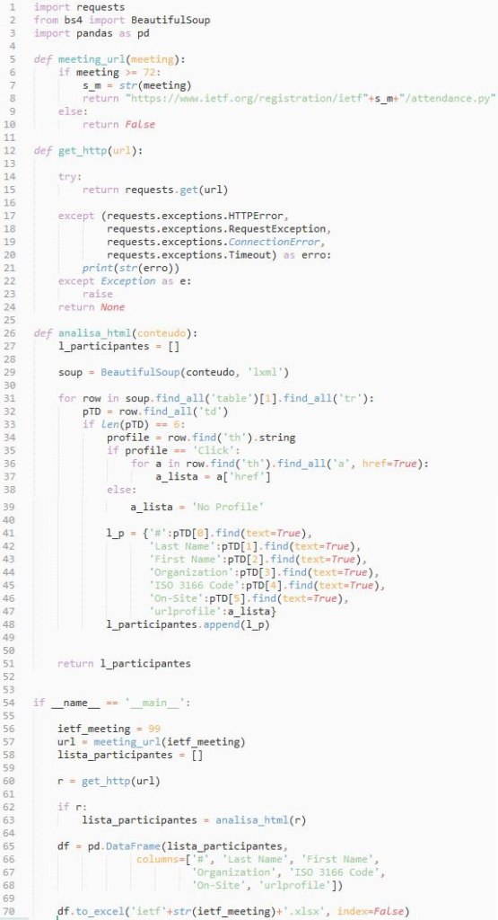 A Figura 8 exibe o código Python do resultado final para captura dos dados dos inscritos no IETF 100. A reunião está indicada na linha 57. O trecho acrescentado para a captura corresponde à função analisa_html, compreendendo as linhas 26 a 52.
