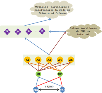 • Todos os servidores estão em redes distintas e remotamente localizados, exceto os recursivos (R), distribuídos a critério dos donos das redes que usam o Itinera.