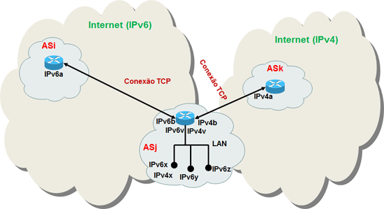 2. As duas Internet estão transparentes. O ex-cliente, agora ASj é dono de seus próprios IPs. Como, geralmente, um AS tem IPv6 e IPv4, ele pode se conectar à Internet IPv6 e/ou IPv4, através de várias técnicas, uma das quais é a pilha dupla, que o modelo subentende.