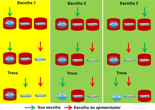 O esquema é o seguinte: Você escolhe uma caixa. O apresentador irá então interferir no processo, abrindo uma das caixas que contem um equipamento usado. A seguir ele lhe pergunta se você quer trocar ou não a sua escolha original. O que você deve fazer? Permanecer na caixa escolhida ou trocar de caixa (só tem mais uma para a troca). Em outras palavras, você tem duas caixas a escolher, o que significa que você tem 50% de ganhar o roteador. O que fazer? Continuar na escolha original ou trocar?