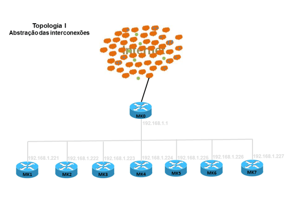 A implementação de rotas estáticas permitiu experimentar o resultado. Tendo sido positivo, a preocupação agora era criar uma topologia que permitisse transformações de forma, sem dificuldade. Então, abstraiu-se das rotas estáticas influenciadas pela rede onde o notebook estava. Em outras palavras, a conectividade foi estabelecida e a figura 2 mostra que a pretensão era uma abstração dessa conectividade para se pensar em outra.