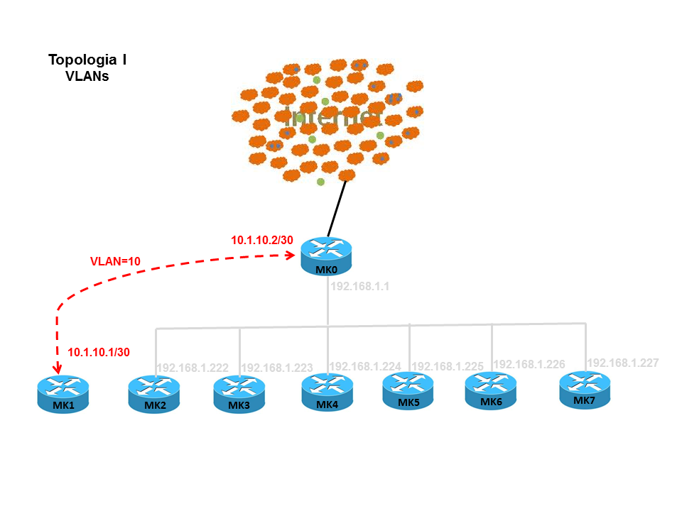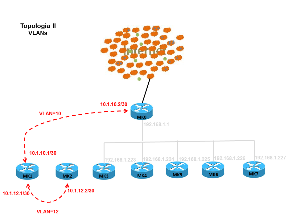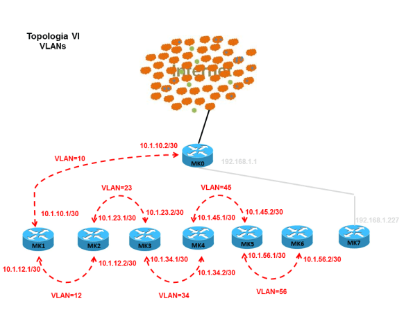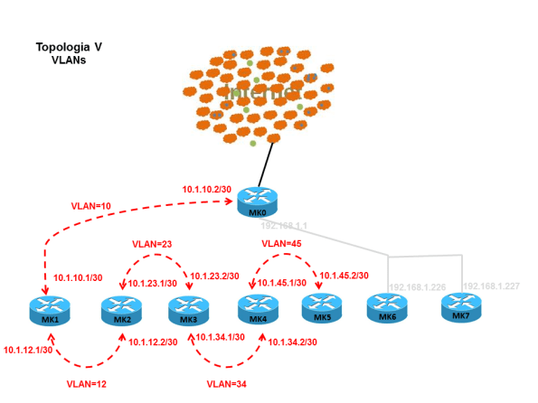 Cada Mikrotik do LVR está identificado como MKn, para n de 0 a 7. O MK0 não é virtual. É um gateway com acesso à Internet. A versalidade do Mikrotik é incrível! Por isso ele foi preferido, inicialmente. Mas, a possibilidade de uma máquina virtual, não limita nenhuma possibilidade, tais como Quagga, Bird [5] e outros. Um hospedeiro poderoso permite asas à imaginação.