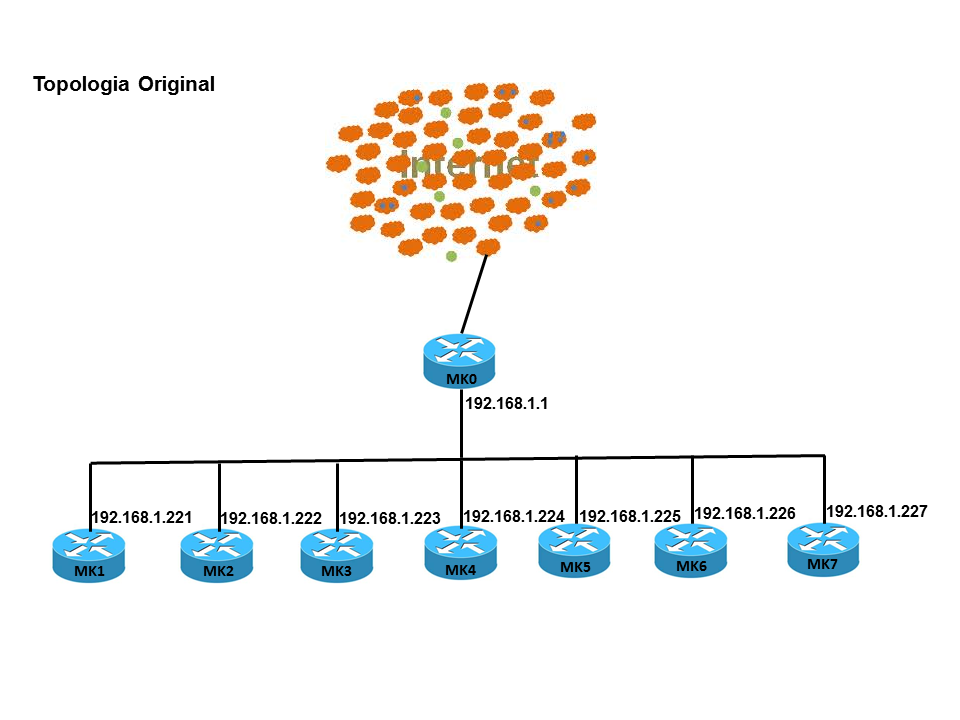 A idéia inicial foi feita sobre 7 (sete) servidores Mikrotiks (MKs), implementados em máquinas virtuais, em um notebook. Usando o esquema simples de roteamento estático, o que foi feito está na figura 1, abaixo. Na figura está um modelo de representar a Internet concebido em [5], onde os ASes estão representados em laranja e PTTs em verde. Vem a calhar, tal representação, para o que iremos falar no futuro.