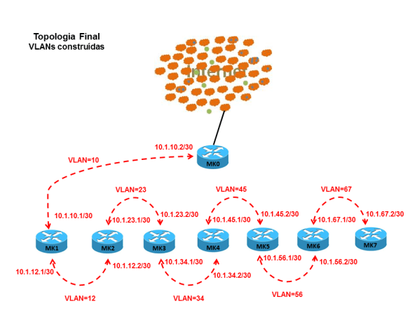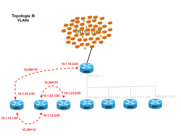 Em seguida, os outros MKs tiveram suas VLANs estabelecidas, conforme mostra as figuras que seguem. Note-se a numeração das VLANs. Por exemplo, a VLAN que conecta o MK0 ao MK1, tem o número 10. O mesmo acontece com os IPs definidos para as VLANs. Sempre são 10.1.n.0/30, onde n é o número da VLAN. Isso obrigou uma rota estática do 10.1.0.0/17 para os vizinhos. Tudo para facilitar a implementação.